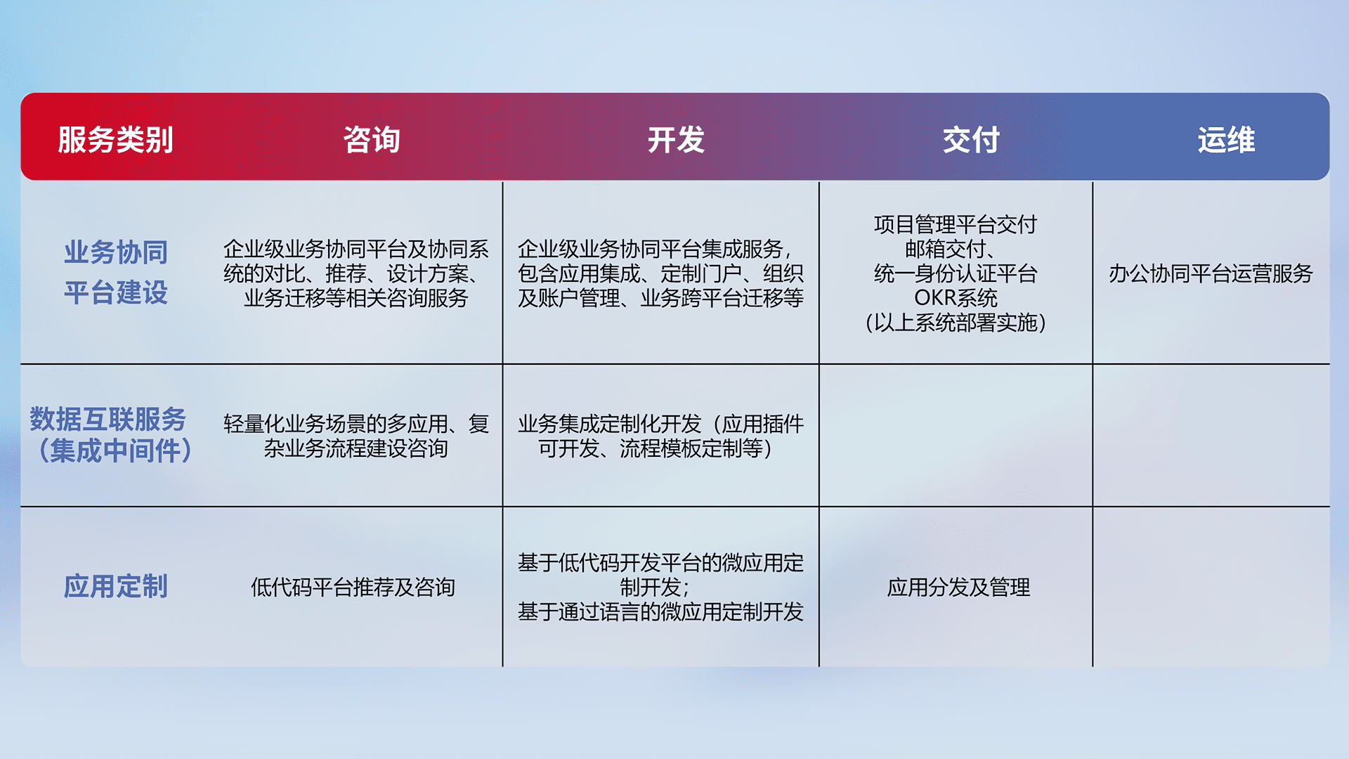 针对钉钉、、、、企微、、IDaas等平台级产品提供产品的规划、、、、方案、、、、交付、、、定制化开发等服务,,,,实现如统一协同办公、、、、智能客户服务、、混合会议管理、、、、智能数据查询、、等业务场景,,,,实现数字化转型。。